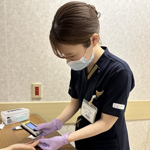 現在、糖尿病・内分泌科、腎臓内科、形成外科、リウマチ科、心療内科の混合病棟で勤務しています。糖尿病教育やシャント造設後の管理など患者さんやその家族へ指導をする場面があります。自宅での生活を見据えたかかわりは大変なこともありますが、先輩方と相談し、個別性を心がけかかわっています。患者さんのインスリン手技が獲得できたときなど、患者さんのできることが増えた場面に立ち会うことができたときにやりがいを感じます。
