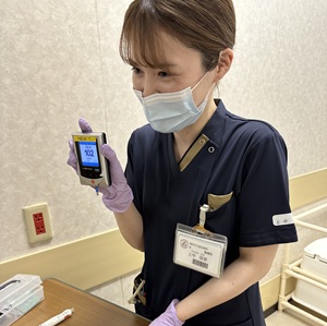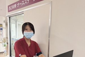 私の所属する内科病棟では、呼吸器、消化器、循環器、糖尿病といった様々な疾患の患者様が入院され、幅広く疾患・看護について学べるため良い刺激の多い毎日です。点滴や輸血の実施、ドレナージ管理、ERCPなどの急性期治療が主な業務です。またスムーズな回復期への移行ができるよう、入院後早い段階からスタッフや他職種と連携を取り、退院支援も行っています。回復されていく患者様から感謝の言葉を頂き、日々やりがいを感じています。
