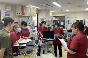 私は、救急部・形成外科・放射線科の混合病棟と救急外来で勤務しています。大学病院で高度な医療を求めて特殊な治療や手術を受けるために入院される患者さんの看護と、救急処置が必要な患者さんの看護を行っています。様々な領域の知識が身につくことや最新の治療に関わることができるところが魅力です。救急外来では、スタッフ同士で声を掛け合いながら一丸となって処置を行い、その後の患者さんの回復していく姿をみるとやりがいを感じられます。