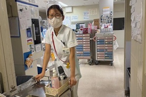 私が所属している病棟は、腫瘍センターといい、がんの治療をしているところです。仕事内容は、化学療法や放射線治療、緩和ケアが中心です。認定看護師など、領域別で特化した看護師が多く所属しているところが魅力でもあり、日々勉強させていただいています。また、治療のために繰り返し入院してこられる方もおり、顔馴染みの患者さんも多いです。「頑張れよ」と声を掛けられると、うれしさもあり、やりがいにも繋がっています。