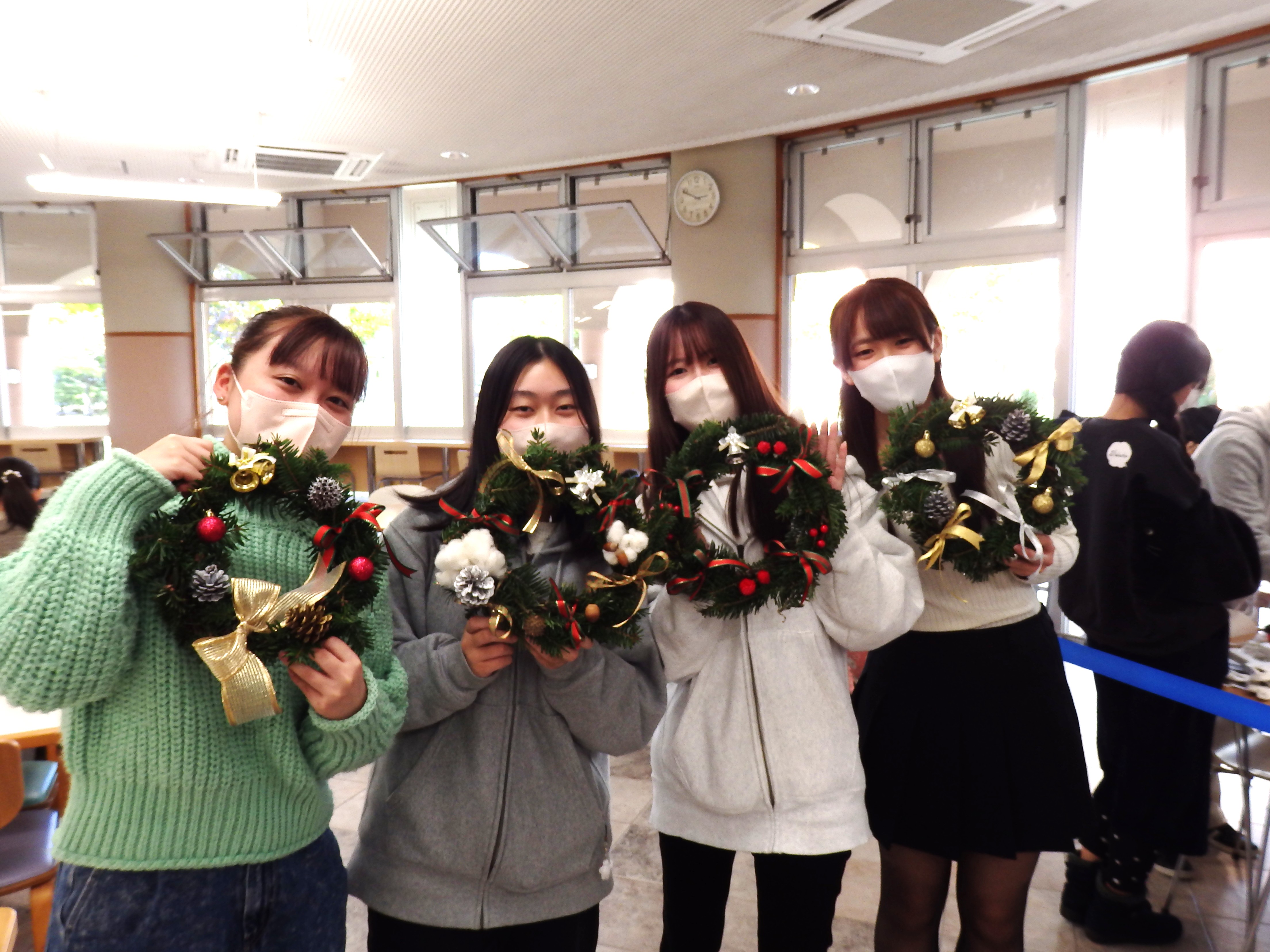 作られたリースは各校舎等の入り口に飾られ、1号館と5号館の玄関ホールには、アドベント・クランツが置かれます。
