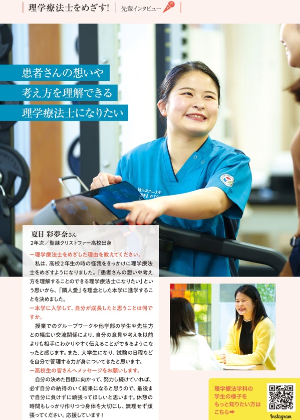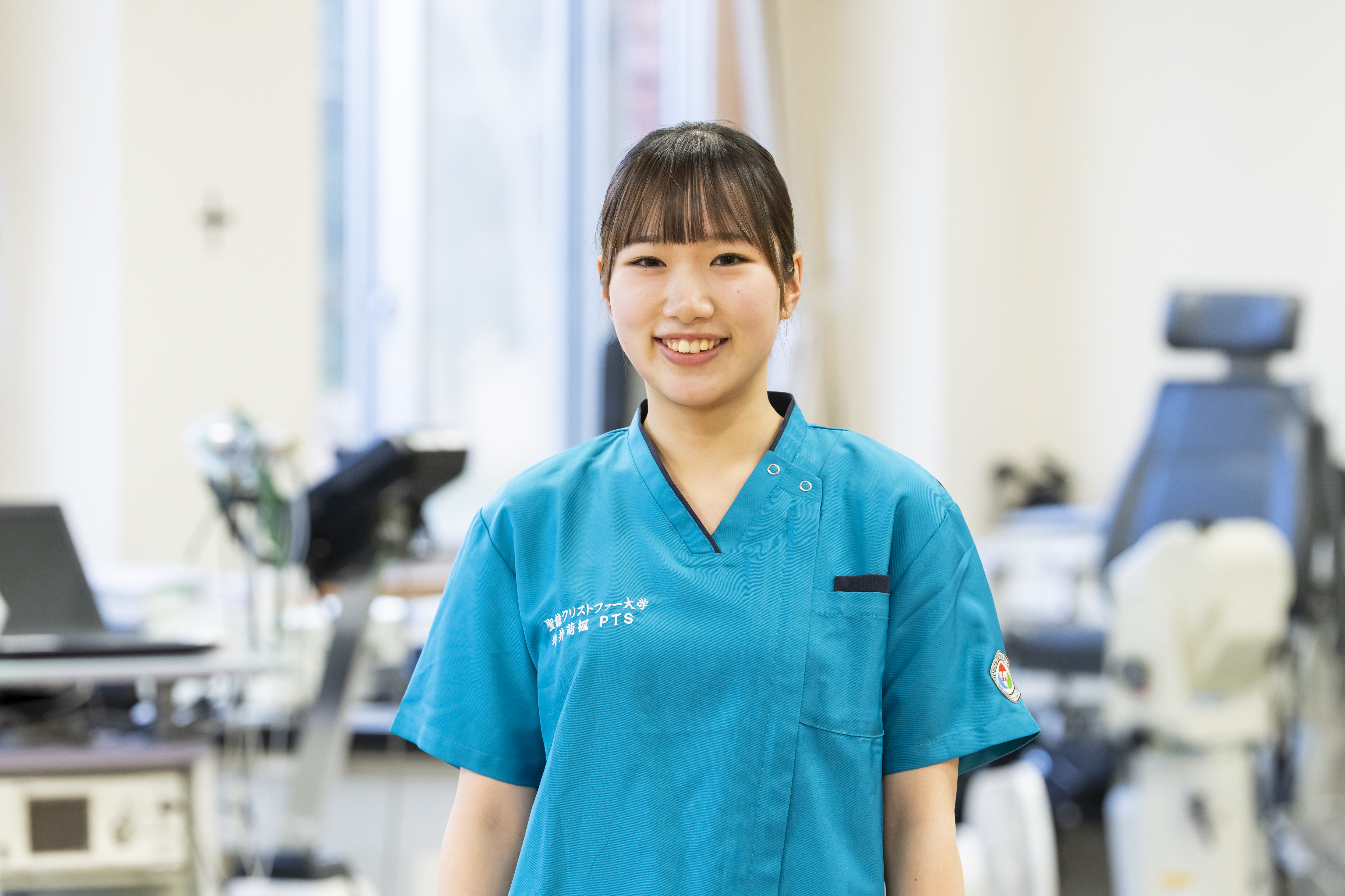 私は、高校1年生の時のけがをきっかけに理学療法士をめざすようになりました。より多くの人の支えとなるために、「国際的に活躍できる理学療法士になりたい」という思いから、国際保健医療福祉プログラムのある本学に進学することを決めました。