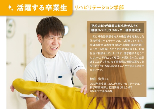 呼吸器疾患の患者様の自宅を訪問し、リハビリテーションを行っています。呼吸器疾患の患者様は日常的な生活においても息切れが生じることで苦しんでいます。そのような方々が自宅で生活を続けることができるよう、運動療法に加えて呼吸法や動作指導を行っています。治療に難渋することもありますが、患者様とともに目標を達成し、喜びを共有できることにとてもやりがいを感じます。大学では授業や実習を通して理学療法の面白さを学ぶことができ、自ら学ぶ姿勢を身につけることができました。