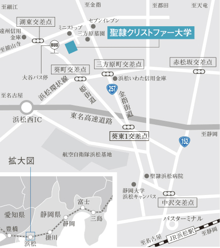 東名高速「浜松西I. C」より浜松環状線を東へ約3km。「葵町」交差点を左折し、北へ約2km。