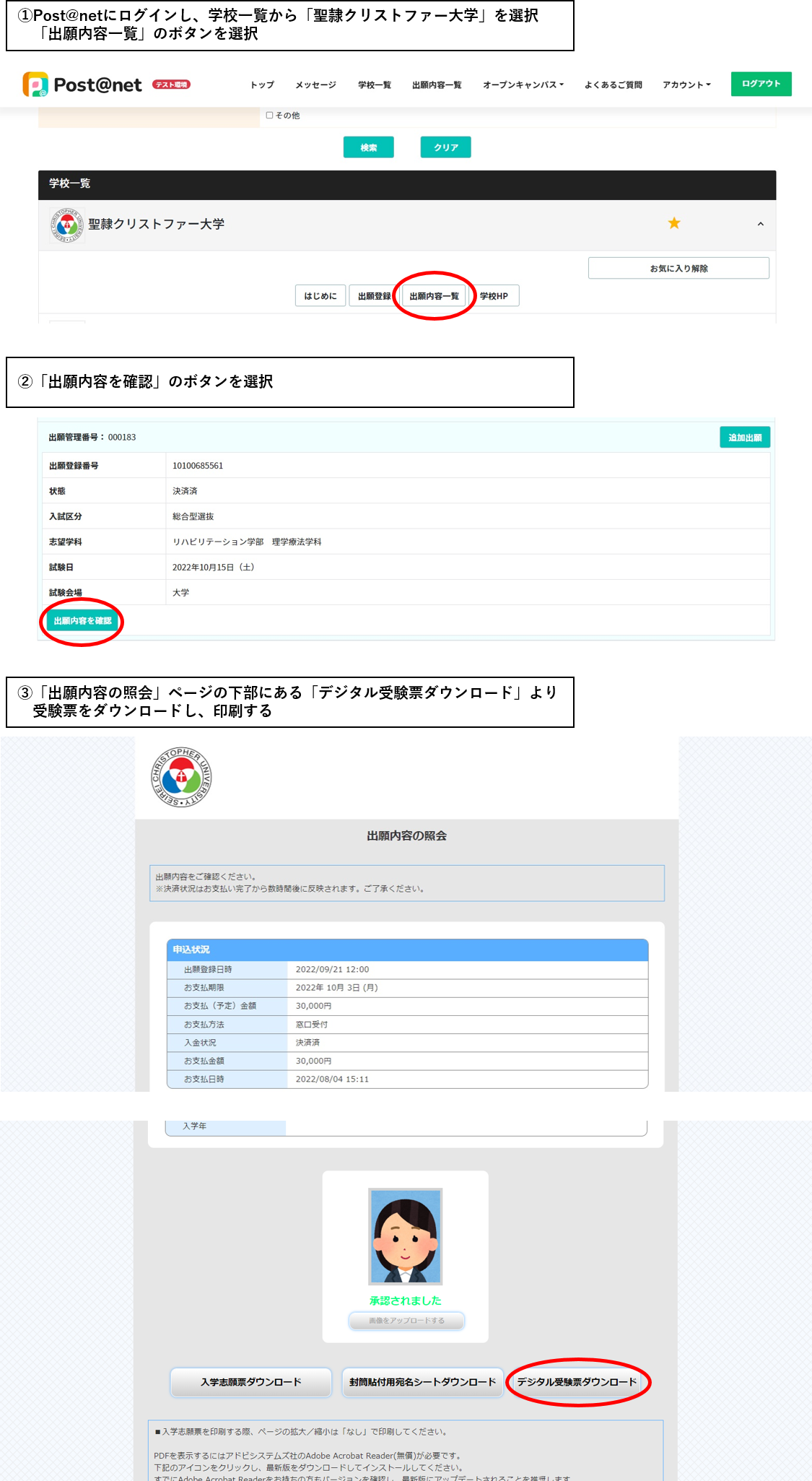- Post@netへログインし「出願内容一覧」より聖隷クリストファー大学の「出願内容を確認」を選択し「デジタル受験票」をクリックして、PDFファイルをダウンロードします。