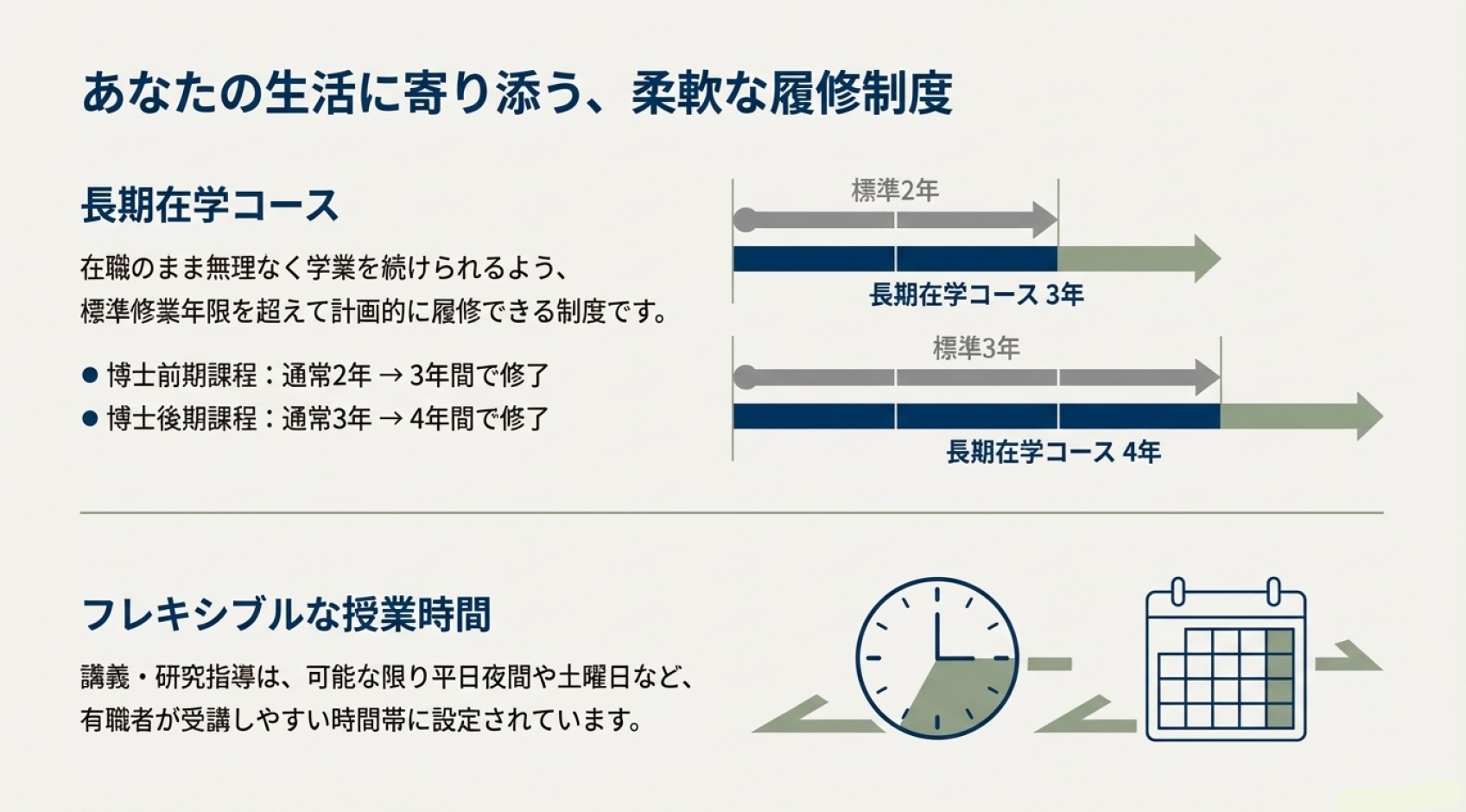 - 長期在学コース:在職のまま学業を続けられるよう、博士前期課程(通常2年)を3年間で、博士後期課程(通常3年)を4年間で修了できる制度を設けています。