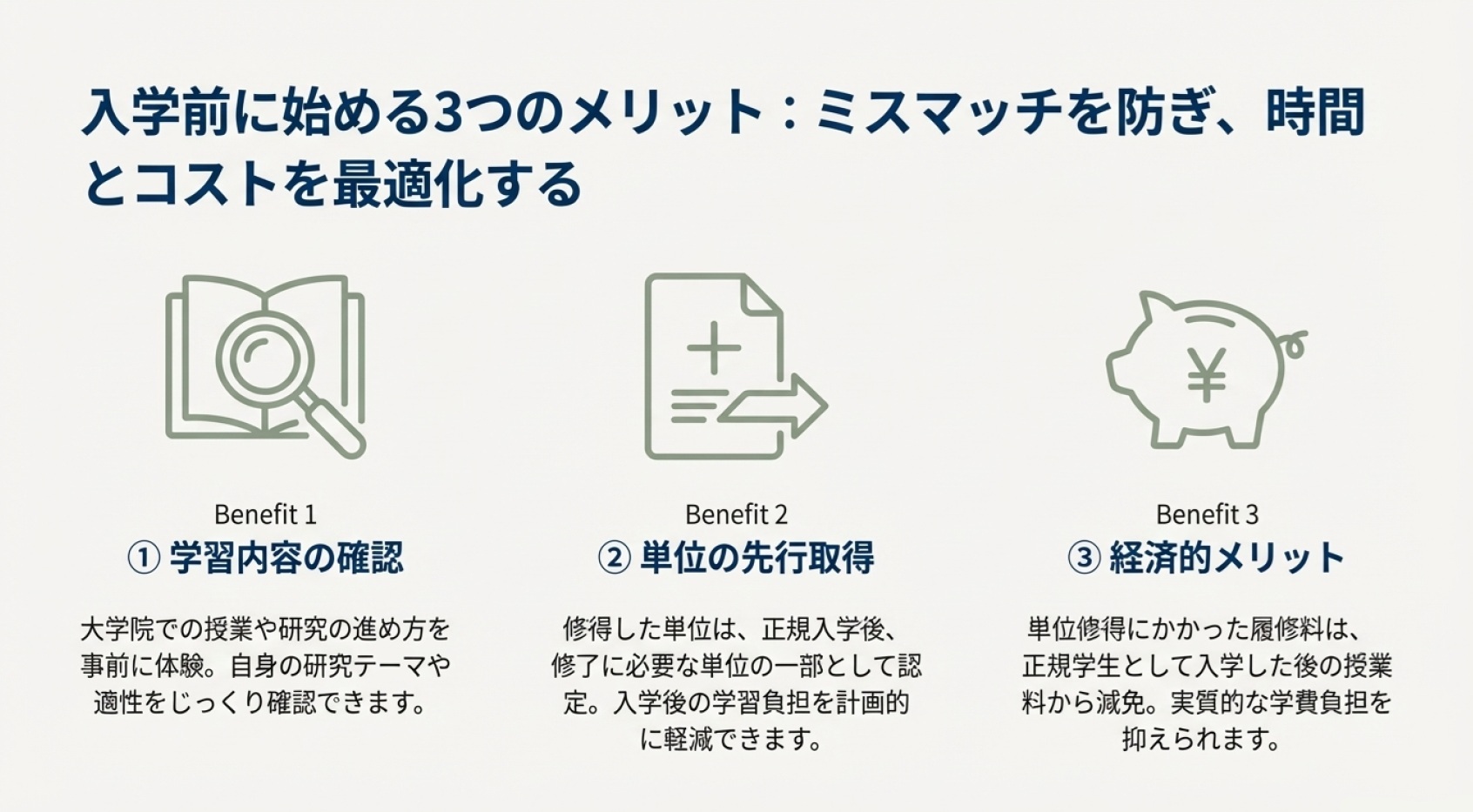 - 単位の先行取得:修得した単位は、正規入学後、修了に必要な単位の一部として認定されます。