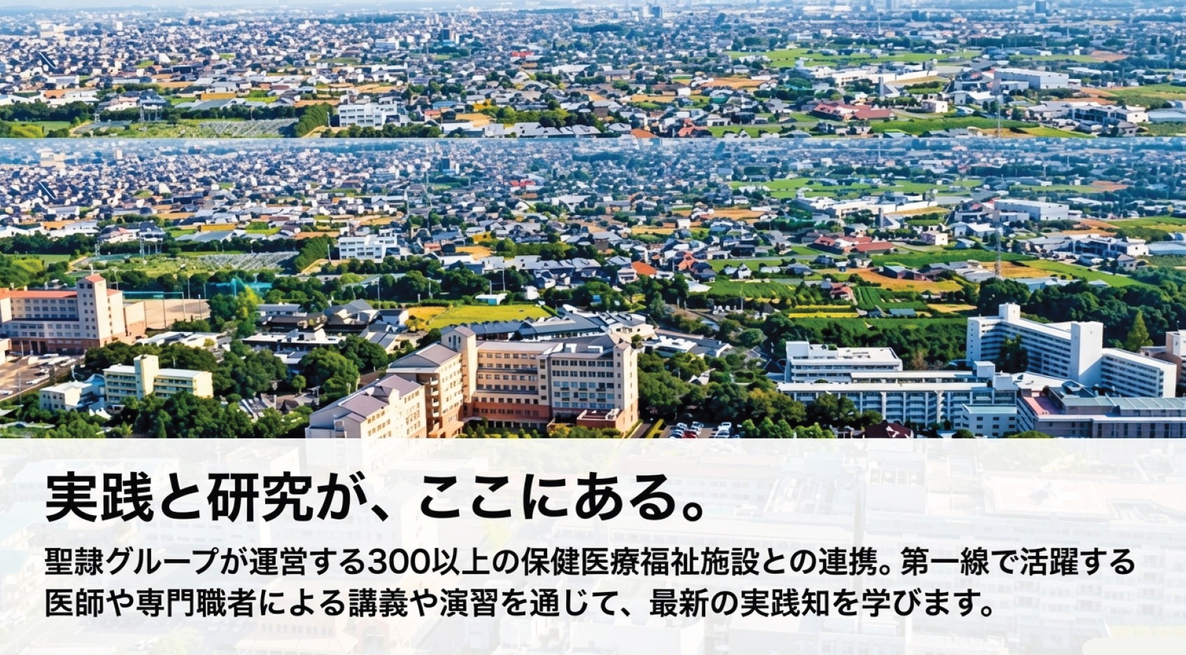 - 最新の知識と技術:保健医療福祉・教育施設を運営する聖隷グループとの連携・協働により、第一線で活躍する専門職者が担当する講義・演習を通じ、最新の情報に基づいた専門職としての力を高めることができます。