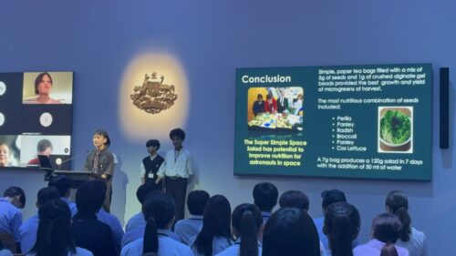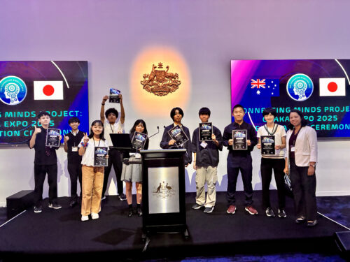 2025年9月21日に大阪・関西万博オーストラリア館で開催された「Connecting Minds Project Presentation」に、本コースの中学2年生7名と高校1年生3名が参加し、オーストラリアのセント・コロンバ・カレッジ(アデレード)の生徒と共同で取り組んできたサイエンスプロジェクトの発表を行いました。