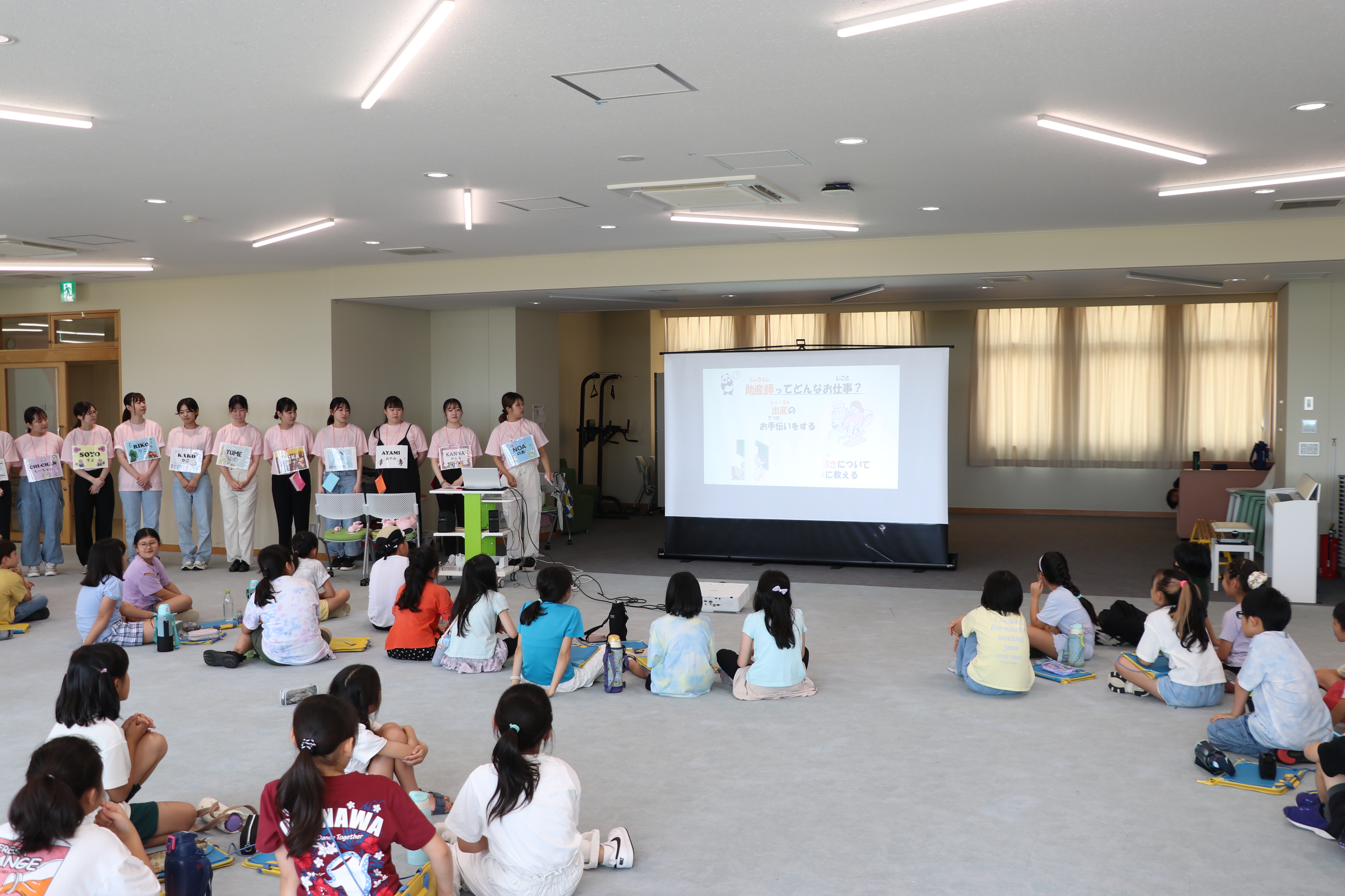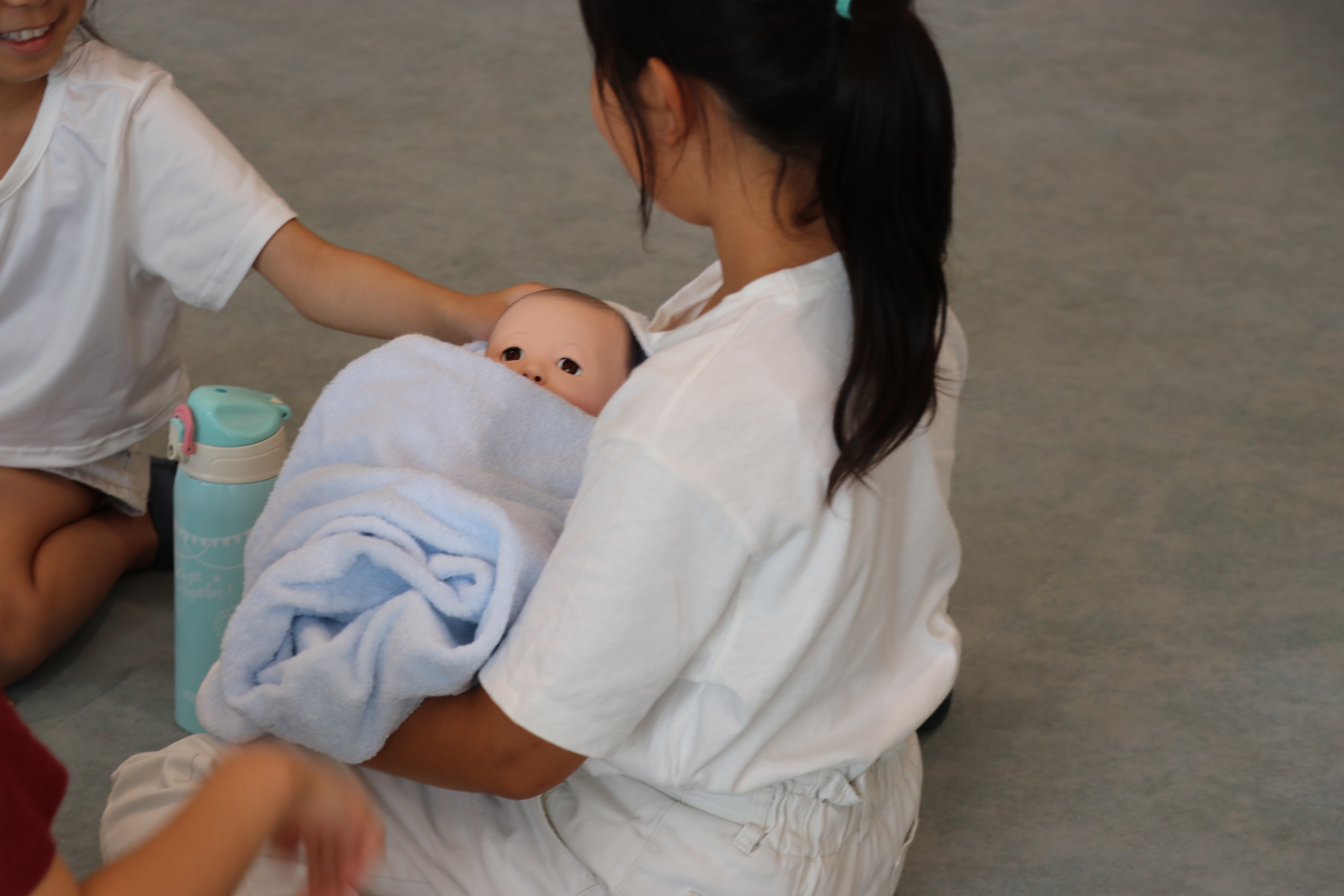 新生児の体重である赤ちゃんの人形を抱っこ体験したうえで、卵子が受精し胎児となり出産を経て人形と同じくらいに大きくなる迄の成長過程をこどもたちに分かりやすく伝えようと、映像やクイズを交えながら説明を行いました。こどもたちは学生の説明に熱心に耳を傾け、質問には積極的に手を挙げて発言し、なかには学生の言葉をメモしているこどももいました。