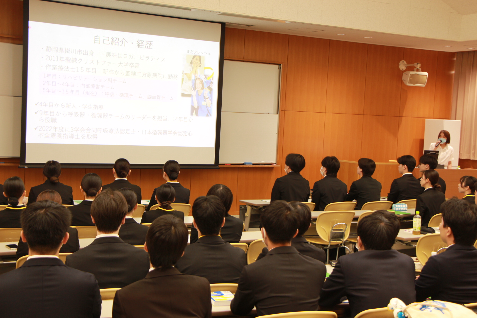 参加した学生からは「聖隷福祉事業団について詳しく知ることができた。聖隷の中でも、それぞれの病院で特化している部分が異なっていて、とても参考になった」、「病院の特徴だけでなく、給与やキャリアアップ、福利厚生等も聞くことができて、貴重な経験となった」、「実際に卒業生からの話を聞くことができ、参考になった。具体的な話も多く、イメージを何となくだが持つことにも繋げられた」、「今回の説明会で、自分が将来どのようなことをしたいのか考えることができた。今後の実習や学生生活で、より具体的に目標を定められるようにしたい」といった感想がありました。