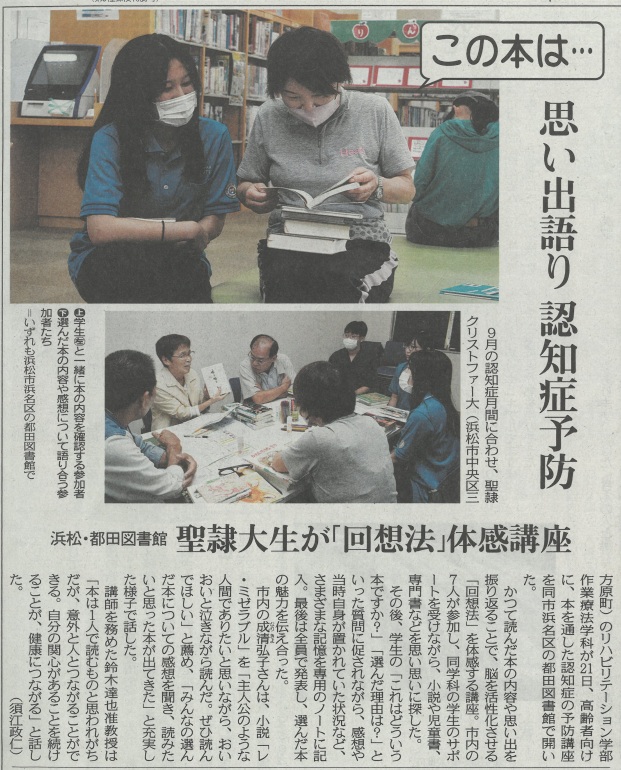 [リハビリテーション学部]作業療法学科の学生が「本を通した認知症の予防講座」を浜松市立都田図書館で実施し、中日新聞に掲載されました。
