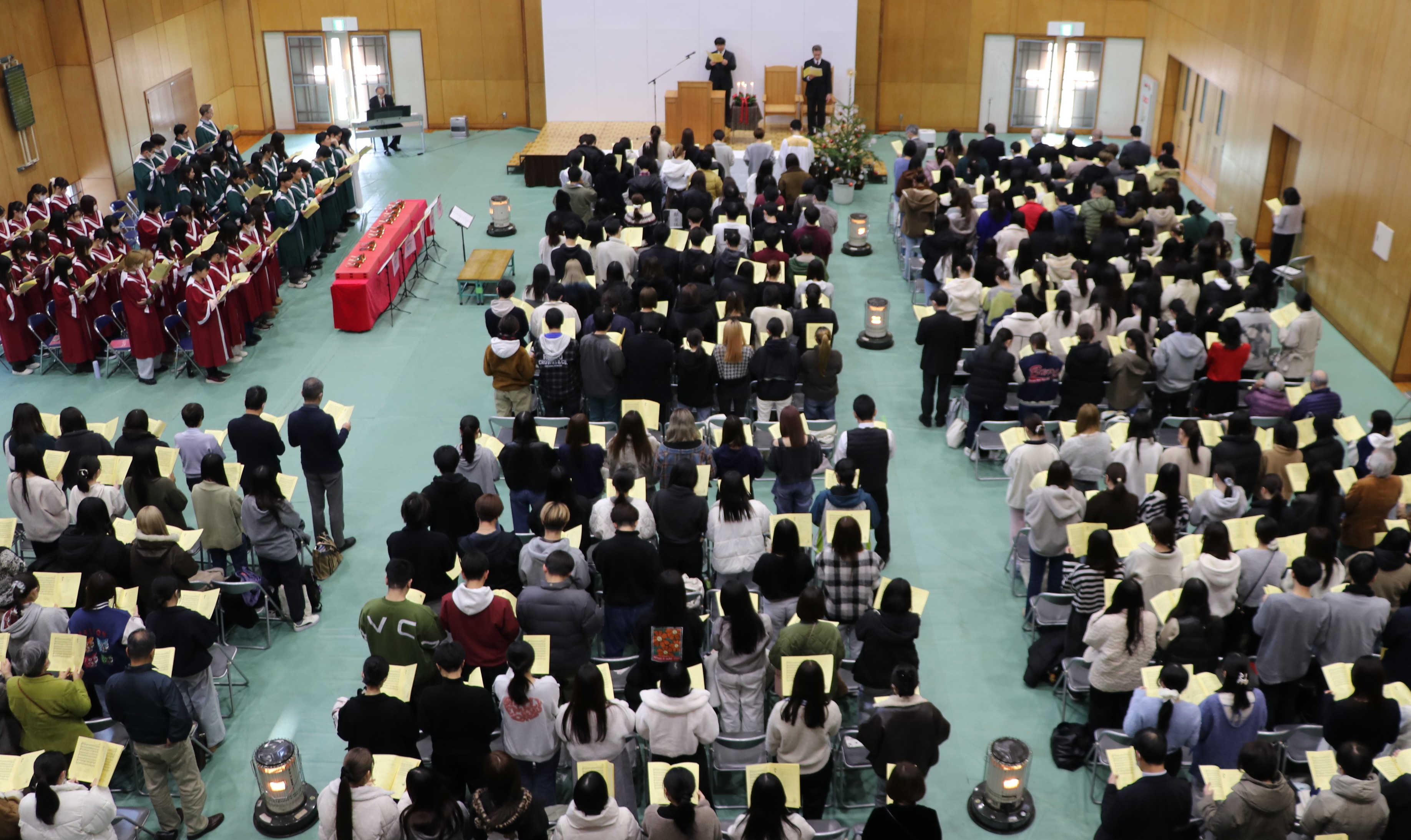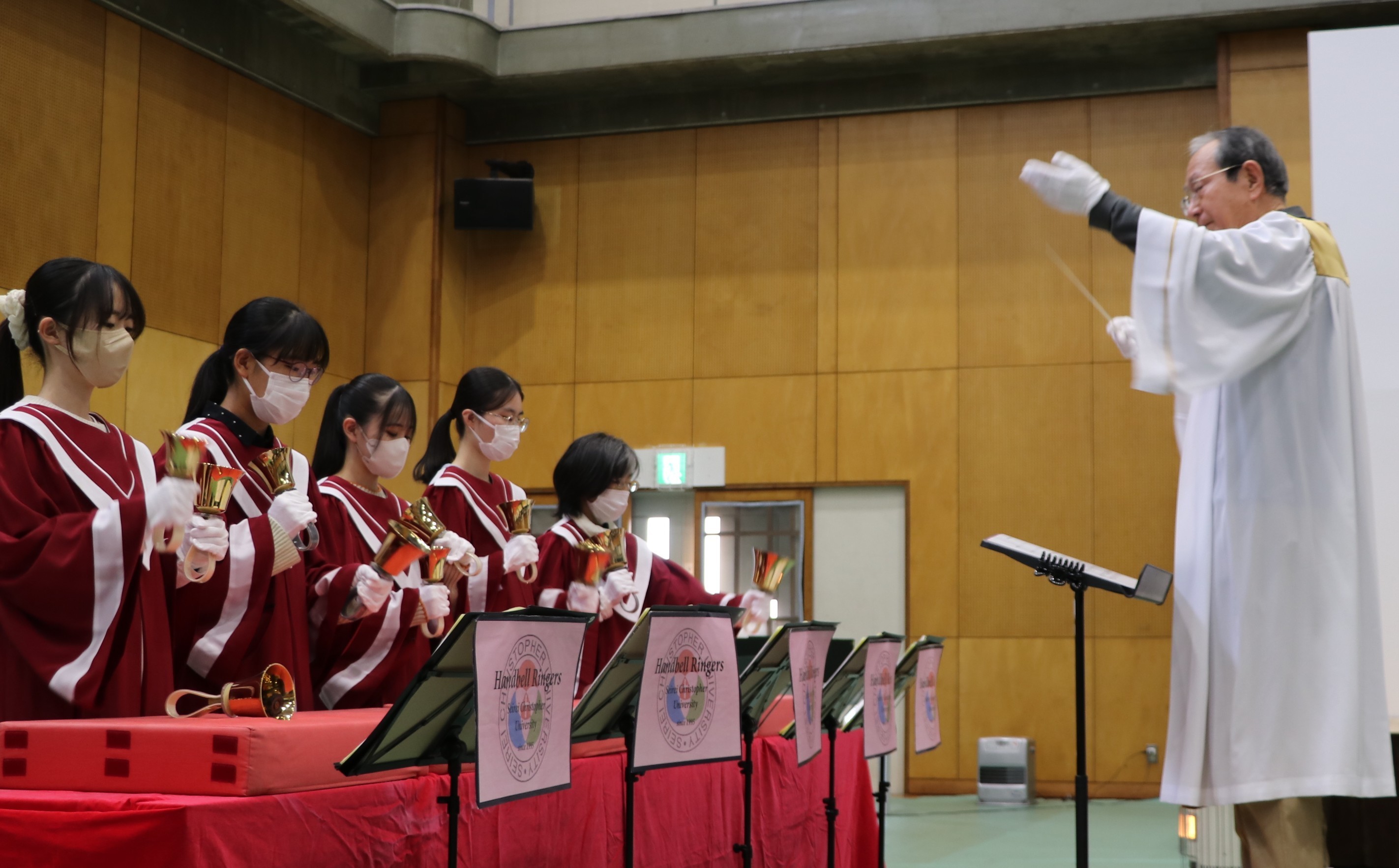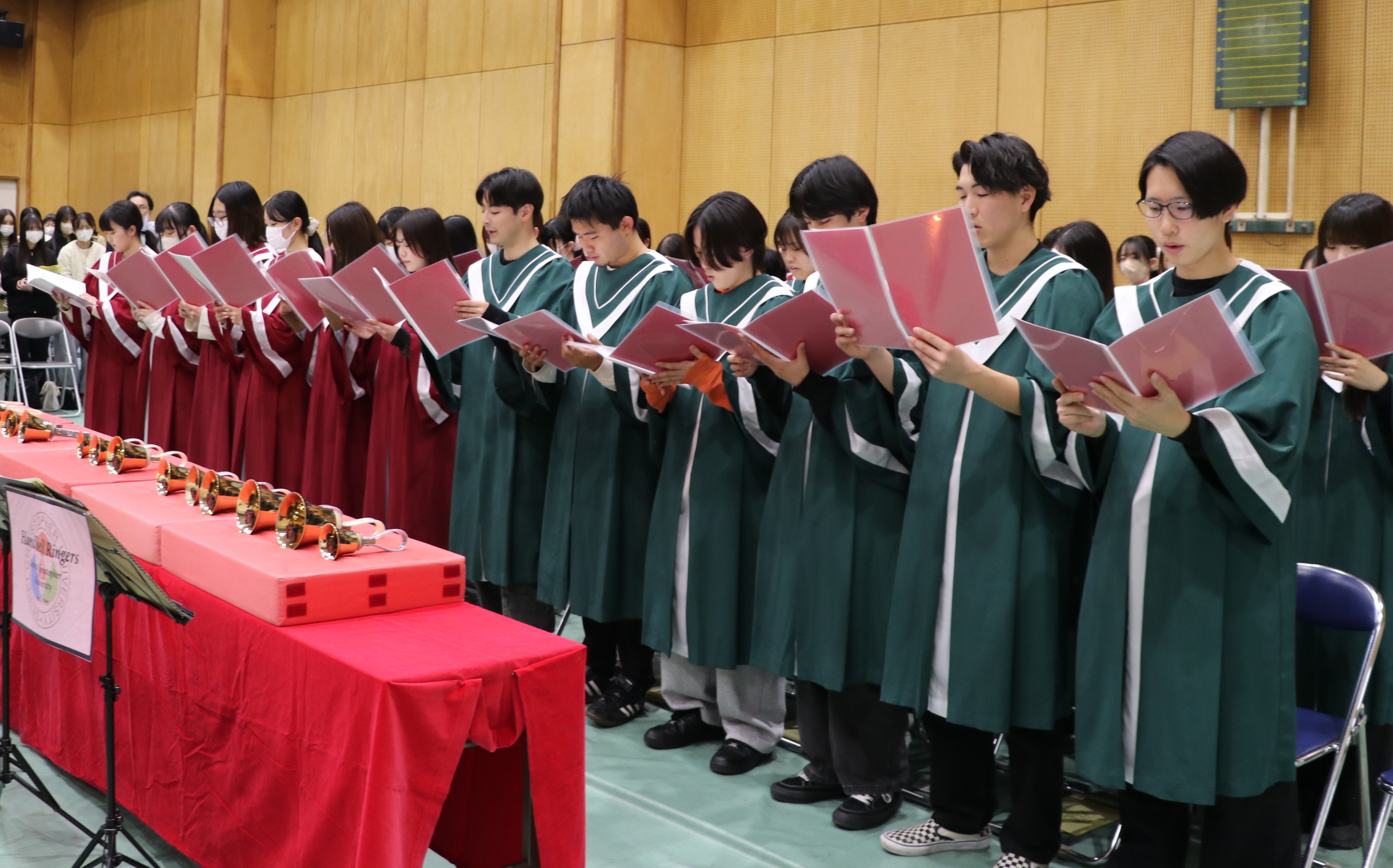 礼拝では、学生による聖書朗読に加え、サークル「ハンドベルリンガーズ」による演奏や聖歌隊の合唱も披露されました。厳かな響きに包まれる中、参列者一同で心静かに祈りを捧げるひとときとなりました。