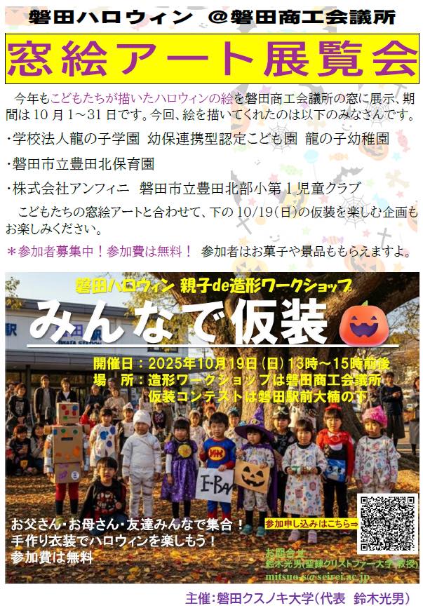10月1日より31日までの約1か月間、磐田商工会議所にて「窓絵アート展」が開催されています。これは、地域の活性化を目的として、アートや文化活動を軸に様々なイベントを企画・運営している磐田市の市民団体「クスノキ大学」の取り組みであり、国際教育学部の鈴木光男教授が主宰しております。