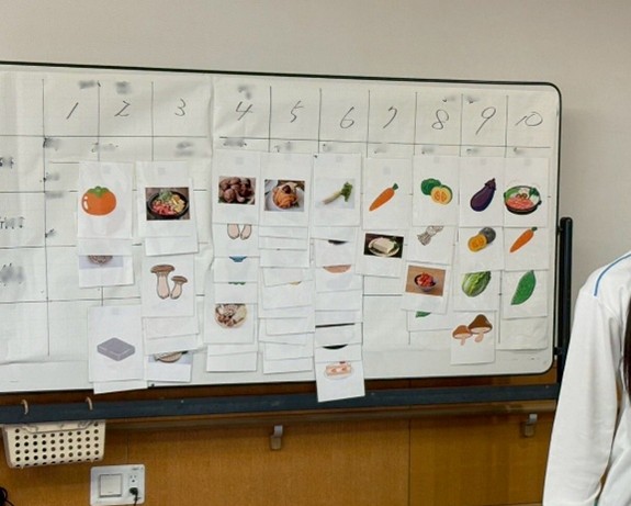 企画したレクリエーションは、『じゃんけんをしてすき焼きの材料を集める』というゲームです。事前に作成したすき焼きの【具材カード】や、じゃんけんができない方のための【じゃんけんカード】を用いて、施設のご利用者の方々と交流しました。ホワイトボードには沢山の具材カードが並び、レクリエーションは大いに盛り上がりました。