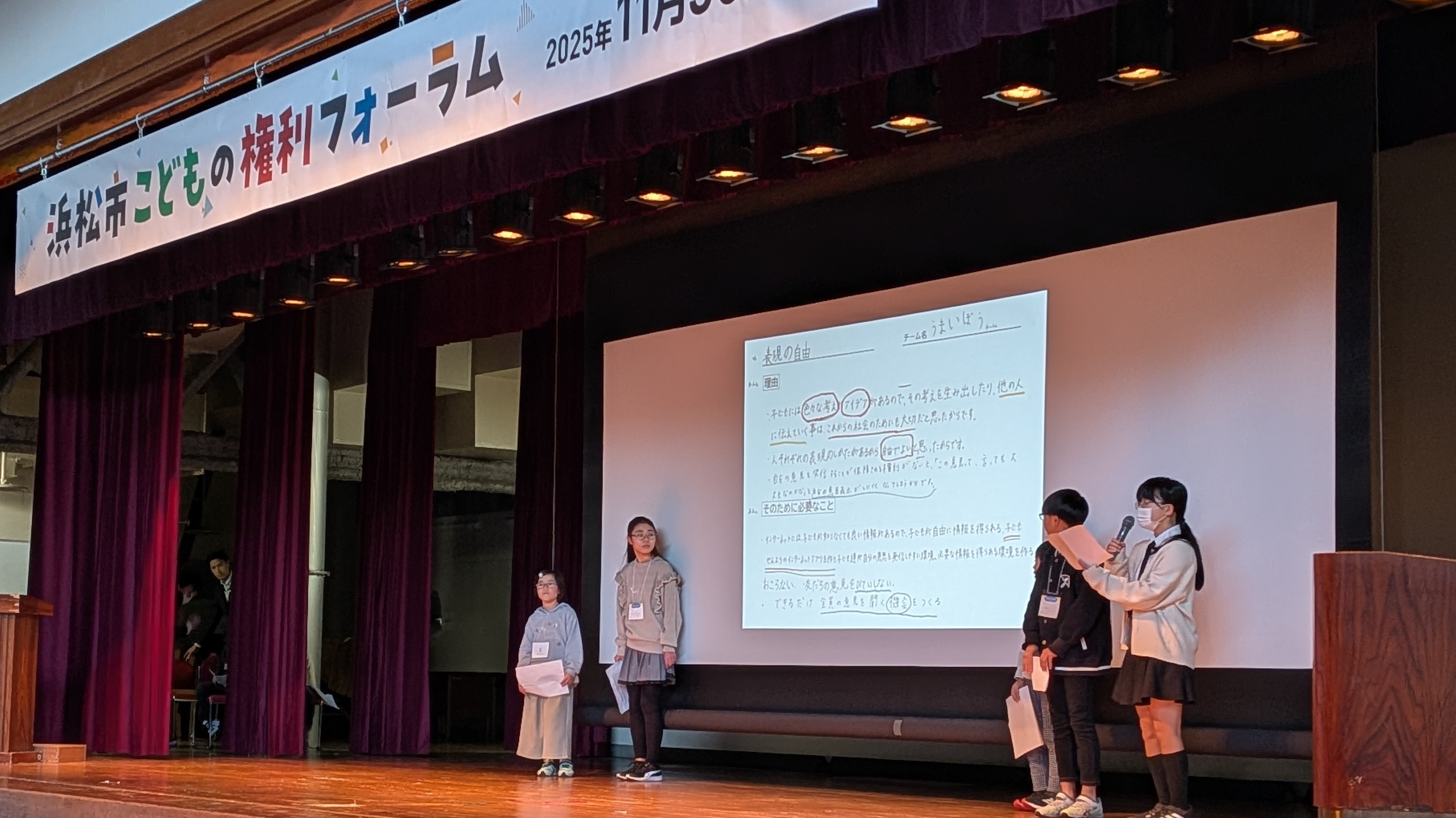 現在、浜松市では「浜松市こどもの権利に関する条例検討委員会」が開催されており、委員長を藤田教授、副委員長を伊豆田弁護士が務めています。本フォーラムでの発表は、「こどもの権利に関する条例」へのこどもたちの意見として年度内にまとめられる予定です。