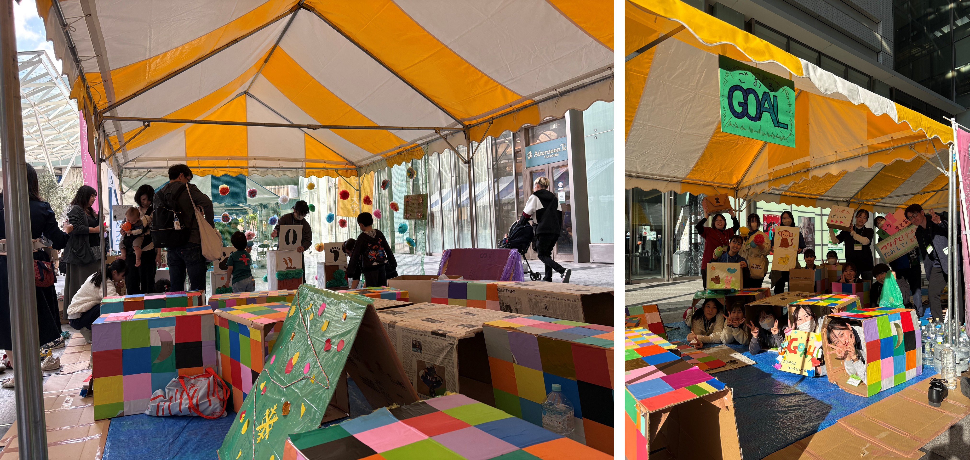 イベントに向け、ボランティアの学生を中心に、事前に何度も準備を重ねていました。特に、ダンボール迷路や的あてゲームの構造物の制作では、来場する小さなお子様が安全かつ最大限に楽しめるよう、設計と設営に工夫を凝らし、入念な作業を進めました。