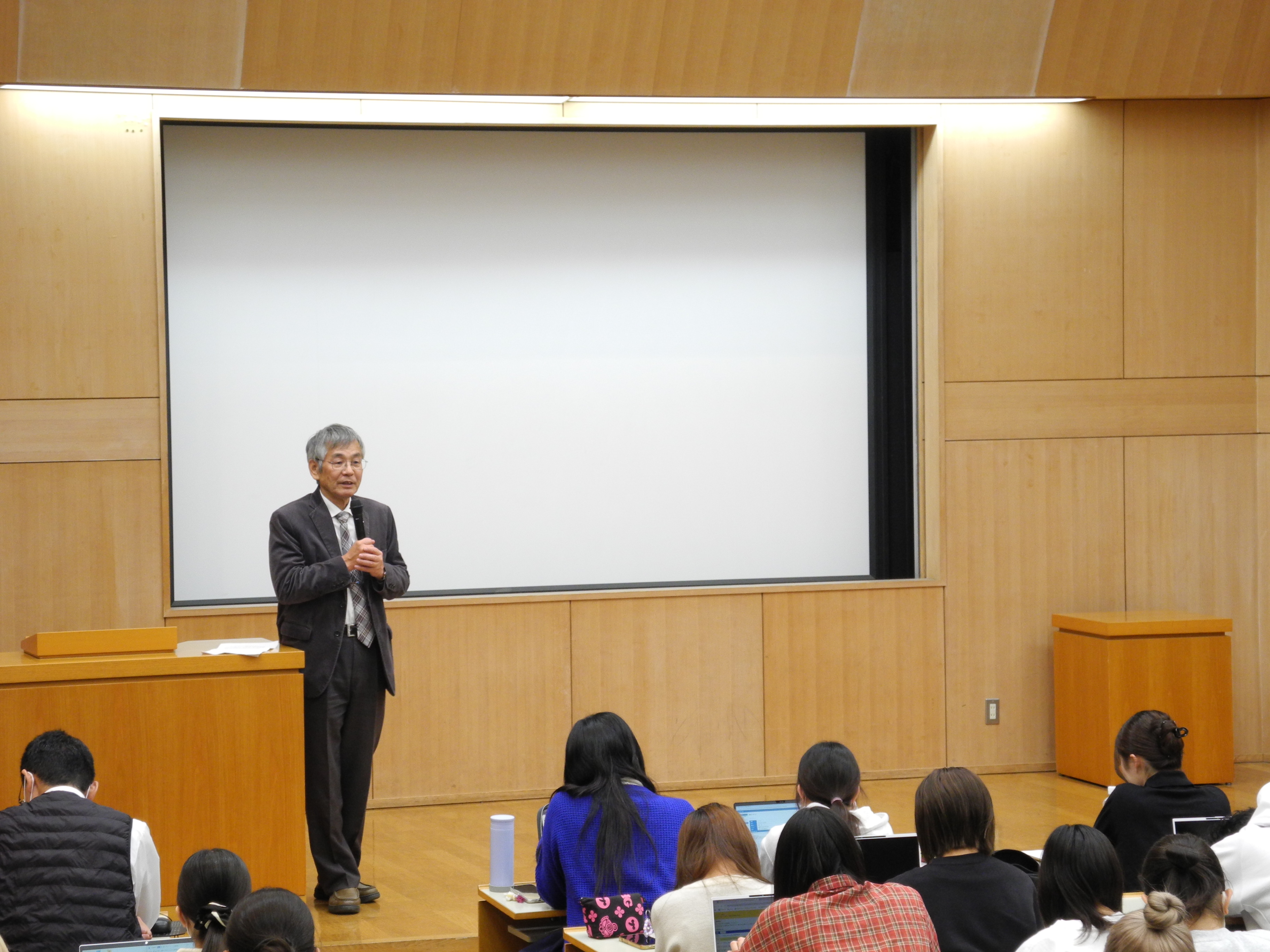 今回は社会福祉法人小羊学園前理事長の稲松義人氏を講師に迎え、子羊学園の創立者・山浦俊治氏が抱いた「小さい者の一人を大切にする」という聖書の精神を学びました。重い障害ゆえに教育や社会から排除されていた子供たちのために、一歩踏み出した歴史は、現在のインクルーシブな社会づくりへと繋がっています。また、稲松氏は支援の実践の中で起きたエピソードを中心に、今後必要とされる支援や制度についても触れ、「皆さんは何を目指して一歩を踏み出すのか」と次世代の福祉・医療を担う学生に問いかけてくださいました。