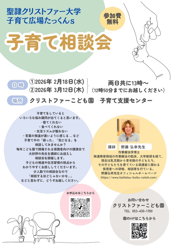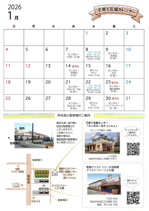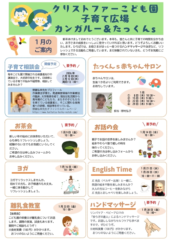 本年も、皆さんと共に子育ての時間を分かち合い、お子さまの成長をいっしょに見守っていければと思います。どうぞよろしくお願いいたします。ひろばでは、お母さまがほっと一息つけるハンドマッサージやヨガなど、リフレッシュできる活動もご用意しています。まだ体験されていない方も、どうぞお気軽にご参加ください。