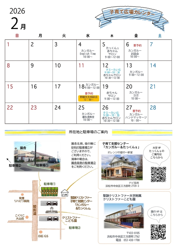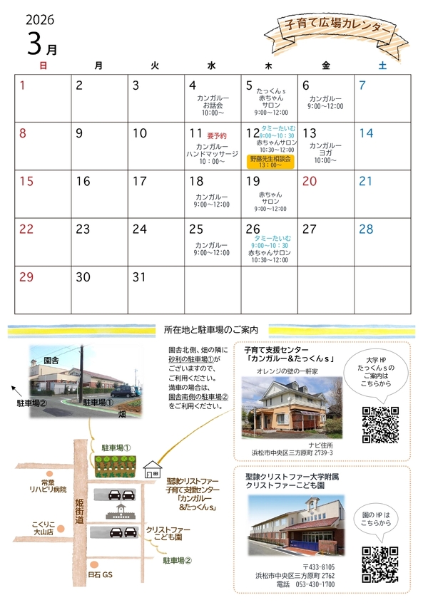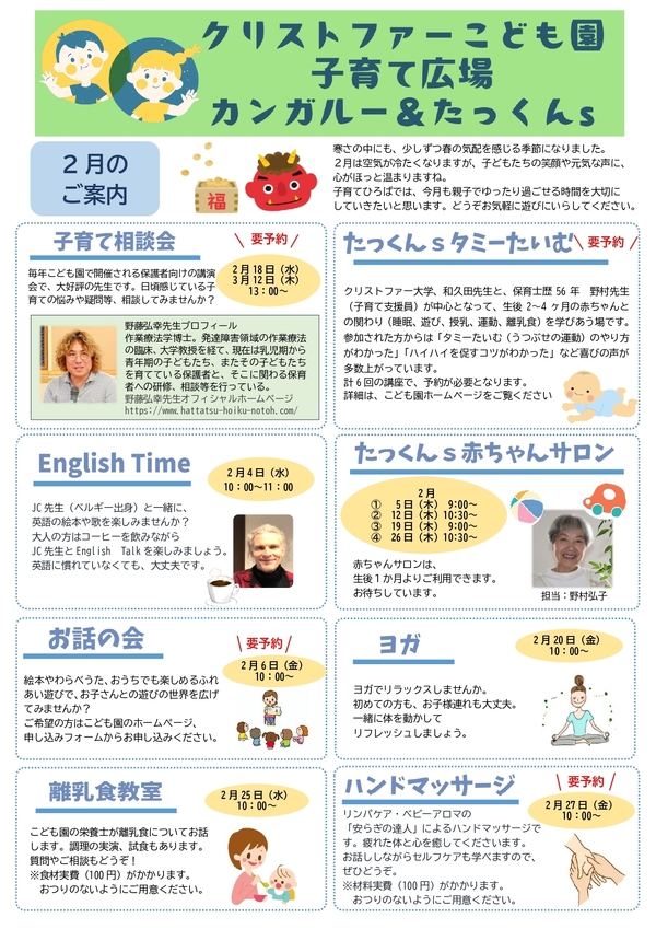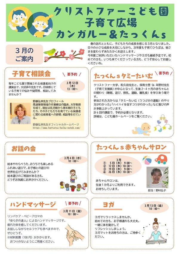 春の訪れとともに、子どもたちの成長を感じる季節となりました。日々の小さな成長を大切にしながら、次年度も子育てひろばは、皆さまを変わらずあたたかくお迎えします。今年度ご好評いただいたハンドマッサージやヨガも継続予定です。初めての方も、いつも来てくださっている方も、どうぞ安心してお越しくださいね。