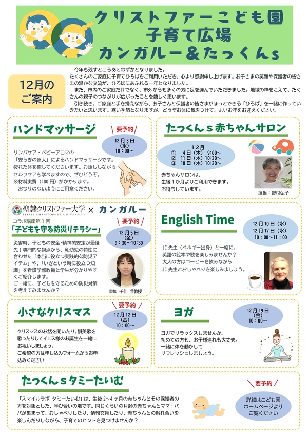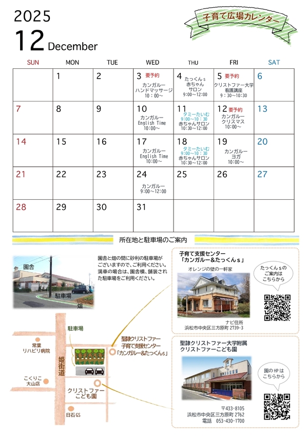 たくさんのご家庭に子育てひろばをご利用いただき、心より感謝申し上げます。お子さまの笑顔や保護者の皆さまの温かな交流が、ひろばにあふれる一年となりました。また、市内のご家庭だけでなく、市外からも多くの方に足を運んでいただきました。地域の枠をこえて、たくさんの親子のつながりが広がったことを嬉しく思います。引き続き、ご家庭と手を携えながら、お子さんと保護者の皆さまがほっとできる「ひろば」を一緒に作っていきたいと思います。寒い季節となりますが、どうぞお体に気をつけて、よいお年をお迎えください。