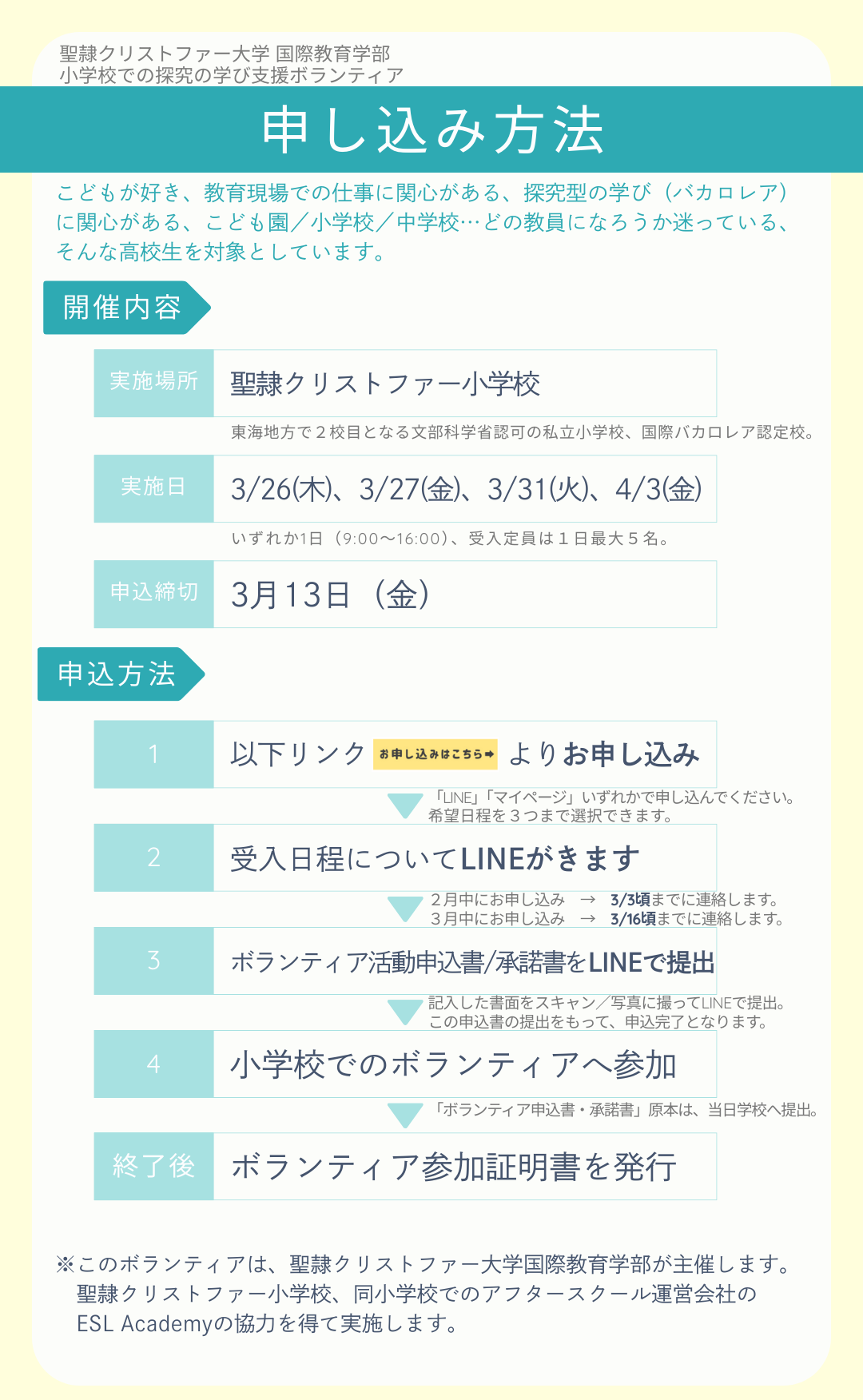 聖隷クリストファー大学国際教育学部では、「小学校での探究の学び支援体験ボランティア」を開催します。