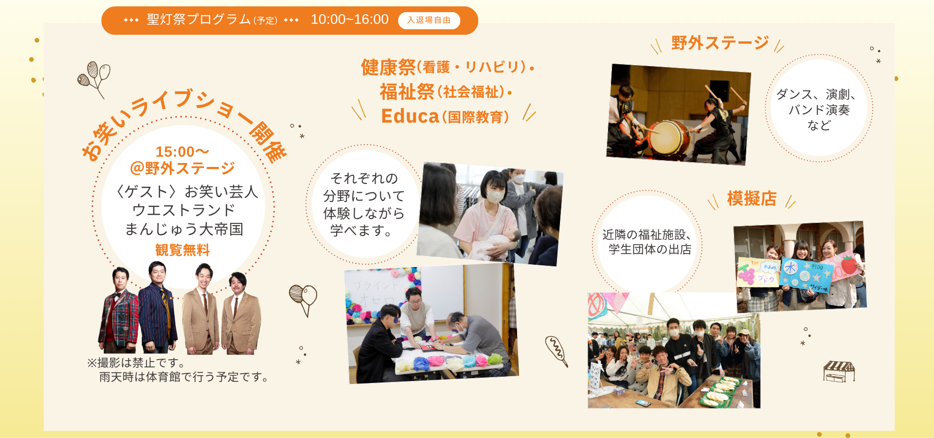 聖灯祭では各学部やサークルによる展示・イベント、近隣の福祉施設や学生団体による模擬店の出店の他、野外ステージでのさまざまな企画が予定されています。
